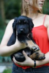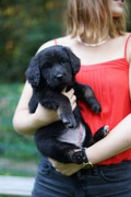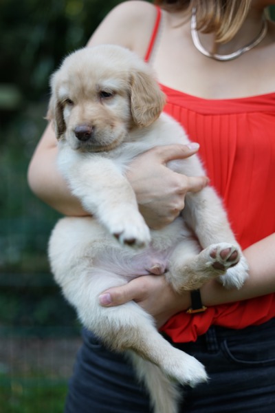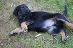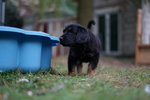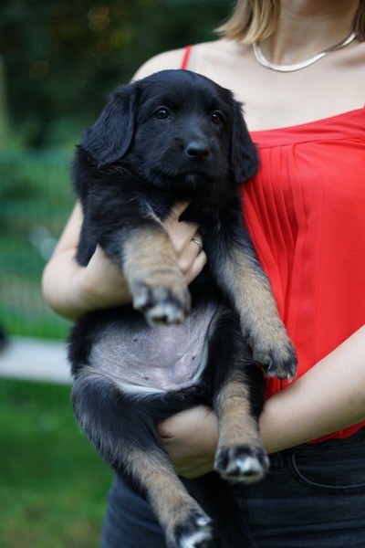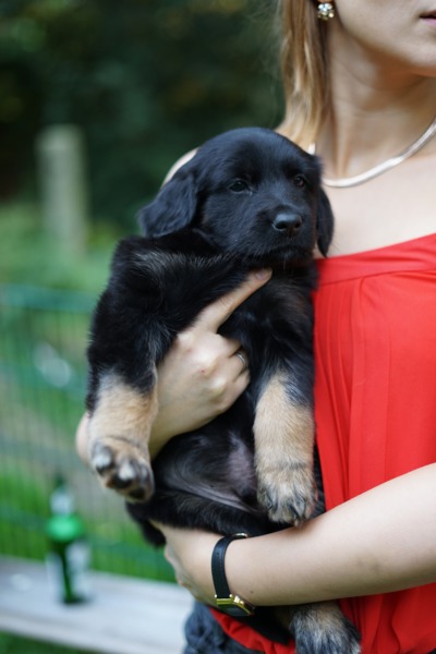 Nach sechs Wochen werden die Welpen langsam frech. Sie beißen mit ihren spitzen Milchzähnen in Hosen und Schnürsenkel und rangeln miteinander. Wir haben auch schon verschiedene Arten von Futter wie Milch, Nudeln, Hühnchen und natürlich Trockenfutter ausprobiert und sie verschlingen alles. Der dickste Rüde wiegt mittlerweile über fünf Kilo.